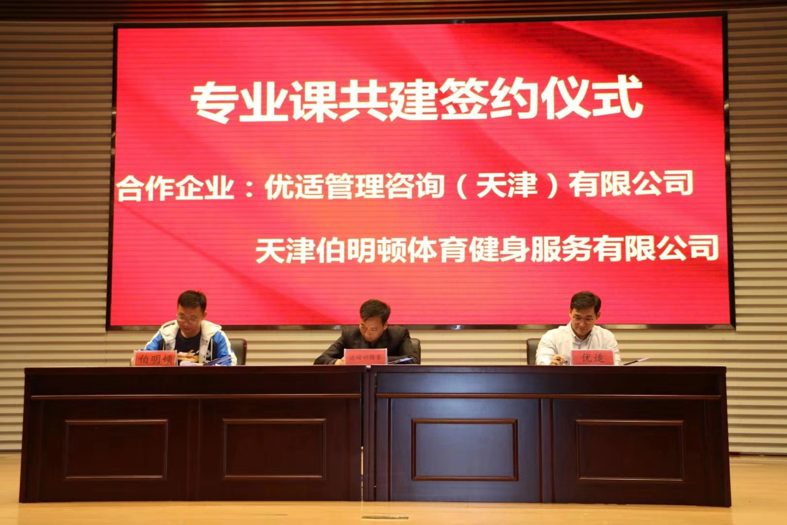 随后,院运动训练系主任潘政彬用多媒体方式从多个方面向参会企业嘉宾介绍运动训练专业发展情况♦️,结合实例深入浅出讲解了学院专业特色、专业定位以及发展趋势。运动训练专业2017级同学王贵杰和毛艺杰作为优秀学生代表上台分享在企业的工作经历和感悟。分享结束后,潘政彬与优适管理咨询(天津)有限公司总经理邢恩源、天津伯明顿体育健身服务有限公司总经理李元签订了专业课共建合作协议。学院领导为各位企业家颁发聘书♍️,为多位校内指导专家颁发证书。