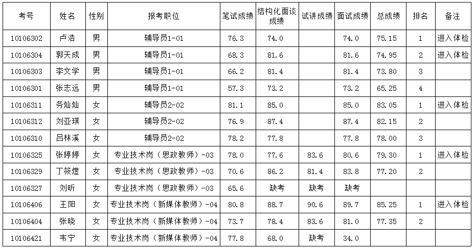 体职院2022年公开招聘工作人员总成绩公示